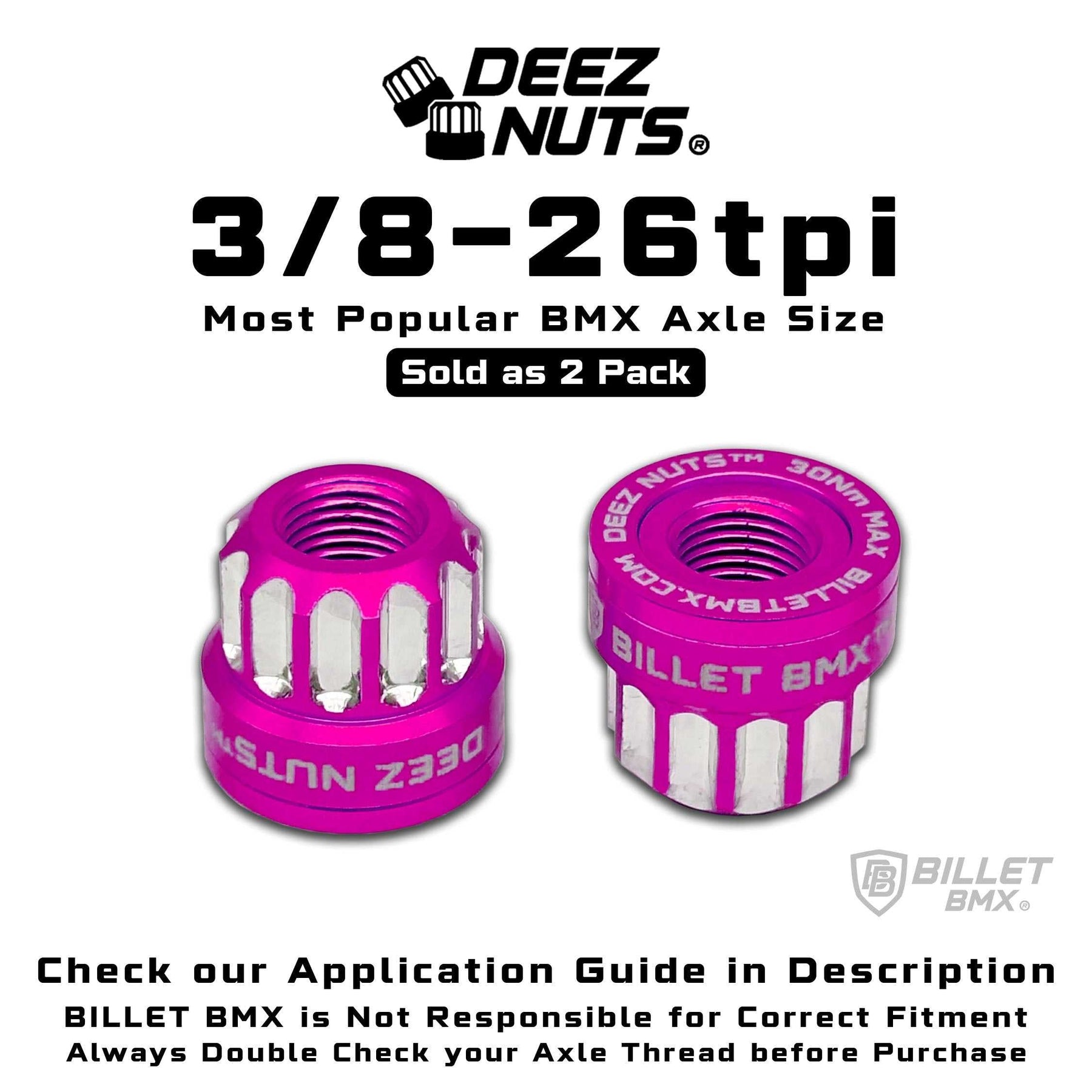 BILLET BMX Deez Nuts™ 12 Point Axle Nuts 3/8 Inch -26 tpi. 12 point No Scratch installation. These are made from 7075 T6 aluminum that are fully CNC machined. The CNC parts are Anodized for shinny appearance and corrosion resistance. They are finished with BILLET BMX signature Laser engraving for high end detail.